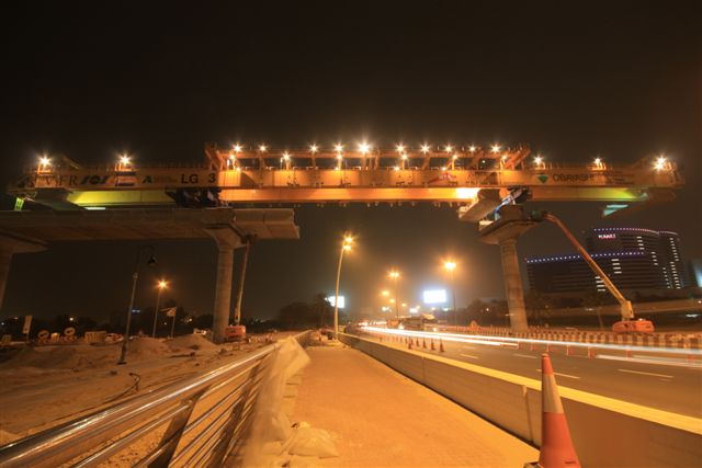 More than 100 spans was built on Falswork system and erected also with heavy lifting mobile and crawler cranes up to 500 ton capacity. The Falswork was made from RMS System and hydraulic Jack on which the segments was aligned and than post tension stressed.| Key Data: | Dubai Metro Rapid Link Project |