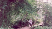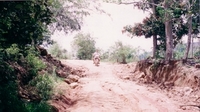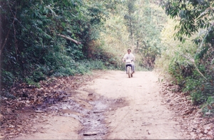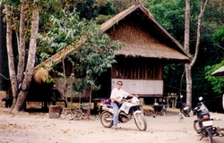 Because driving on the big roads isn't so exciting I tried all the time driving on small roads. One story happened on the way to Utaradit I'll never forget. I drove from Loei in the mountains near the border to Laos up and up and the roads get smaller and smaller. First it was asphalt-roads but this change after a while. Then the last village was also about more than one hour ago when I came to a village were nobody stayed and a lot of the houses was burned and it was like a ghost-town and I got a bad feeling. Actually I got very scared as I saw after the village on the roadside a few guys standing with loincloth and Thai-turban and there had very old gun's with so a long barrel.